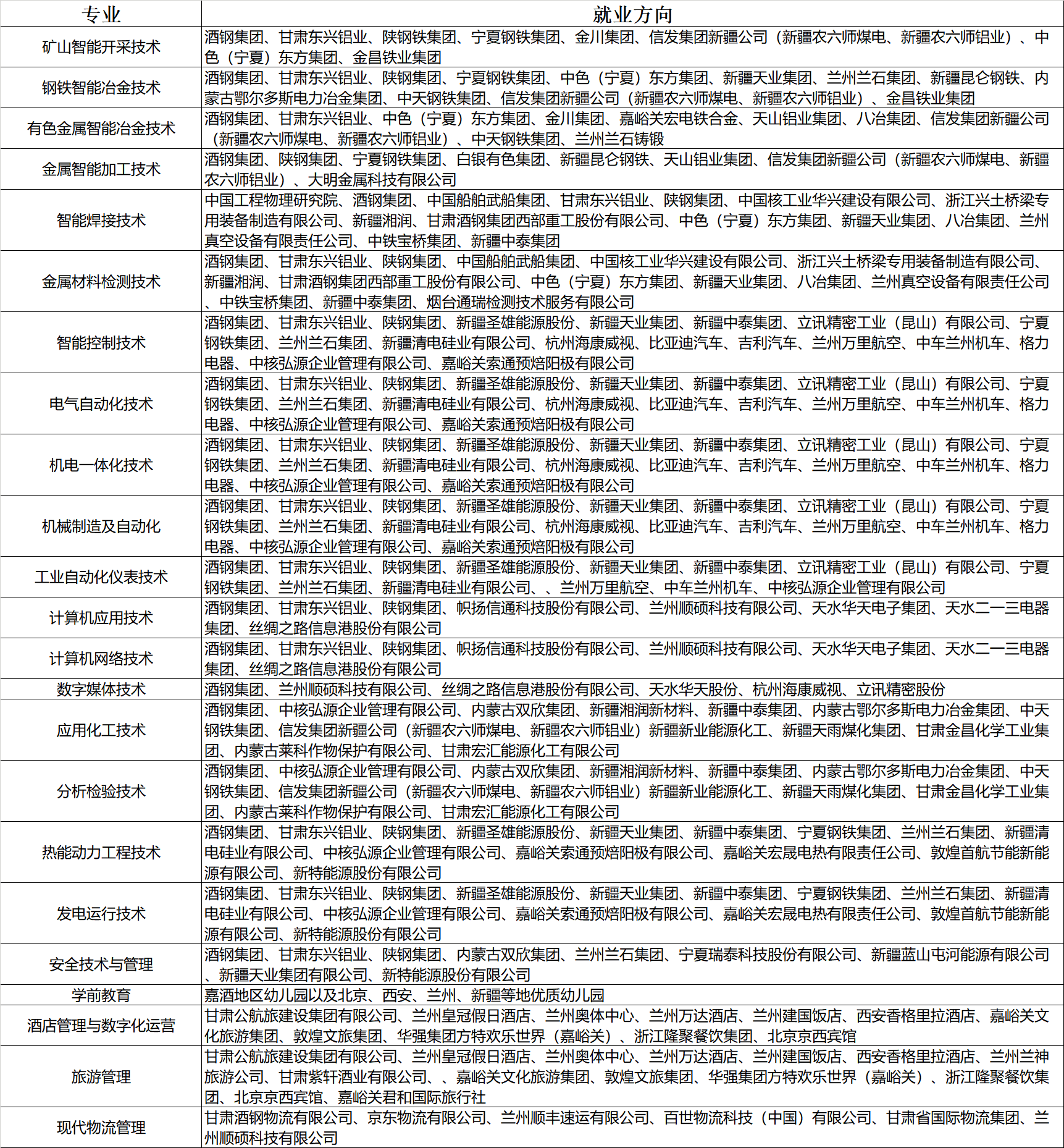 学院充分发挥酒钢集团公司办学特色,着重为酒钢集团公司培养所需高素质技术技能人才,与酒钢集团公司旗下宏兴钢铁股份有限公司、嘉峪关宏晟电热有限责任公司、甘肃东兴铝业有限公司、甘肃酒钢集团西部重工股份有限公司等20家分子单位建立了长期合作关系,并不断开拓中核华兴、中船集团、江南造船、中核弘源、陕钢集团、新疆天业集团、新疆中泰化工、中核华兴及宁夏中色集团等优质合作企业190余家,分类分层进行岗位实习和就业合作。